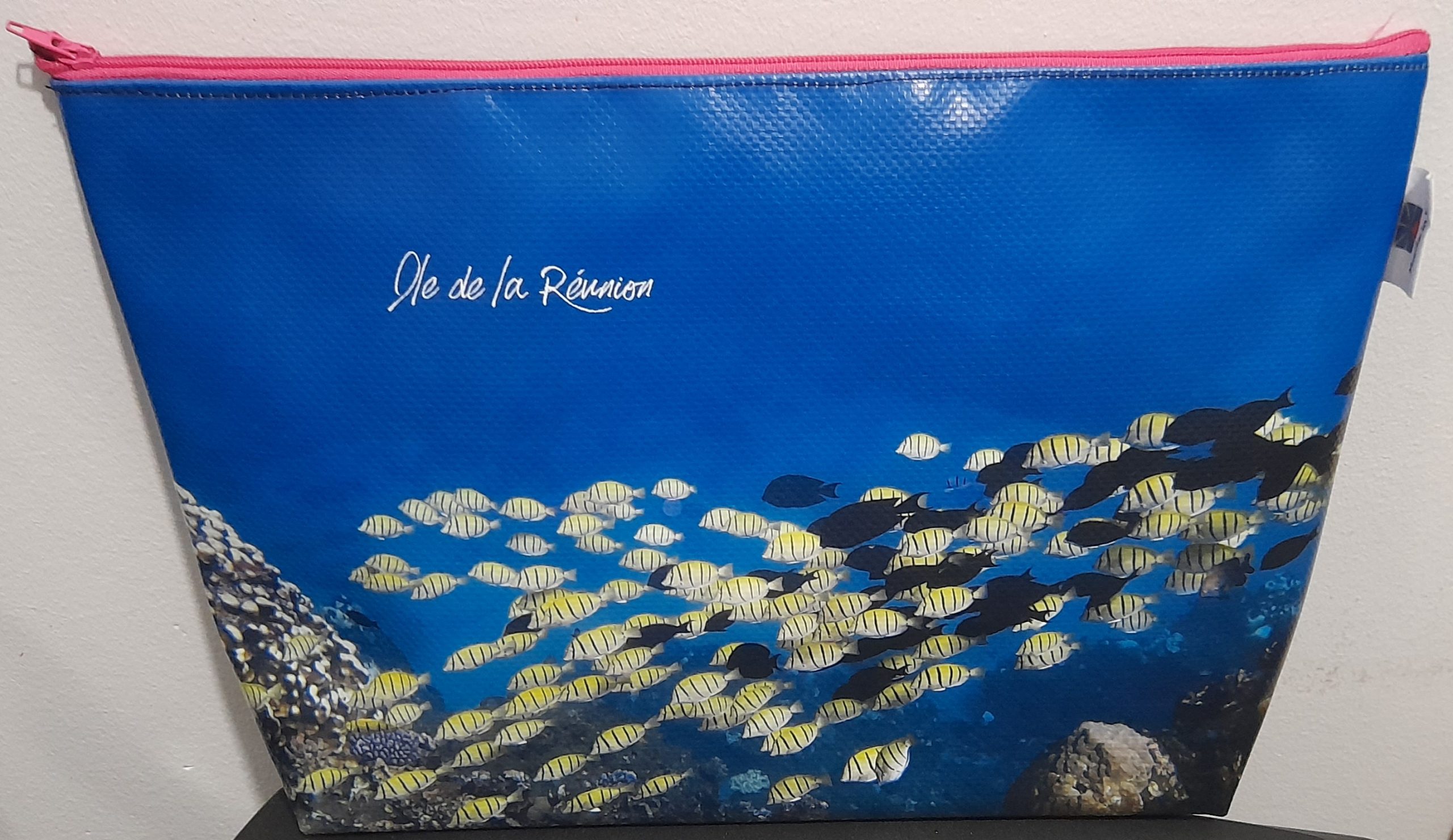 Découvrez notre magnifique trousse de toilette artisanale Emilie de l’île de la Réunion, confectionnée avec soin à la main. La trousse est agrémentée d’une superbe photo d’un banc de poissons noirs et rayés jaunes. Pratique et esthétique, c’est l’accessoire parfait pour une vie quotidienne organisée et stylée.