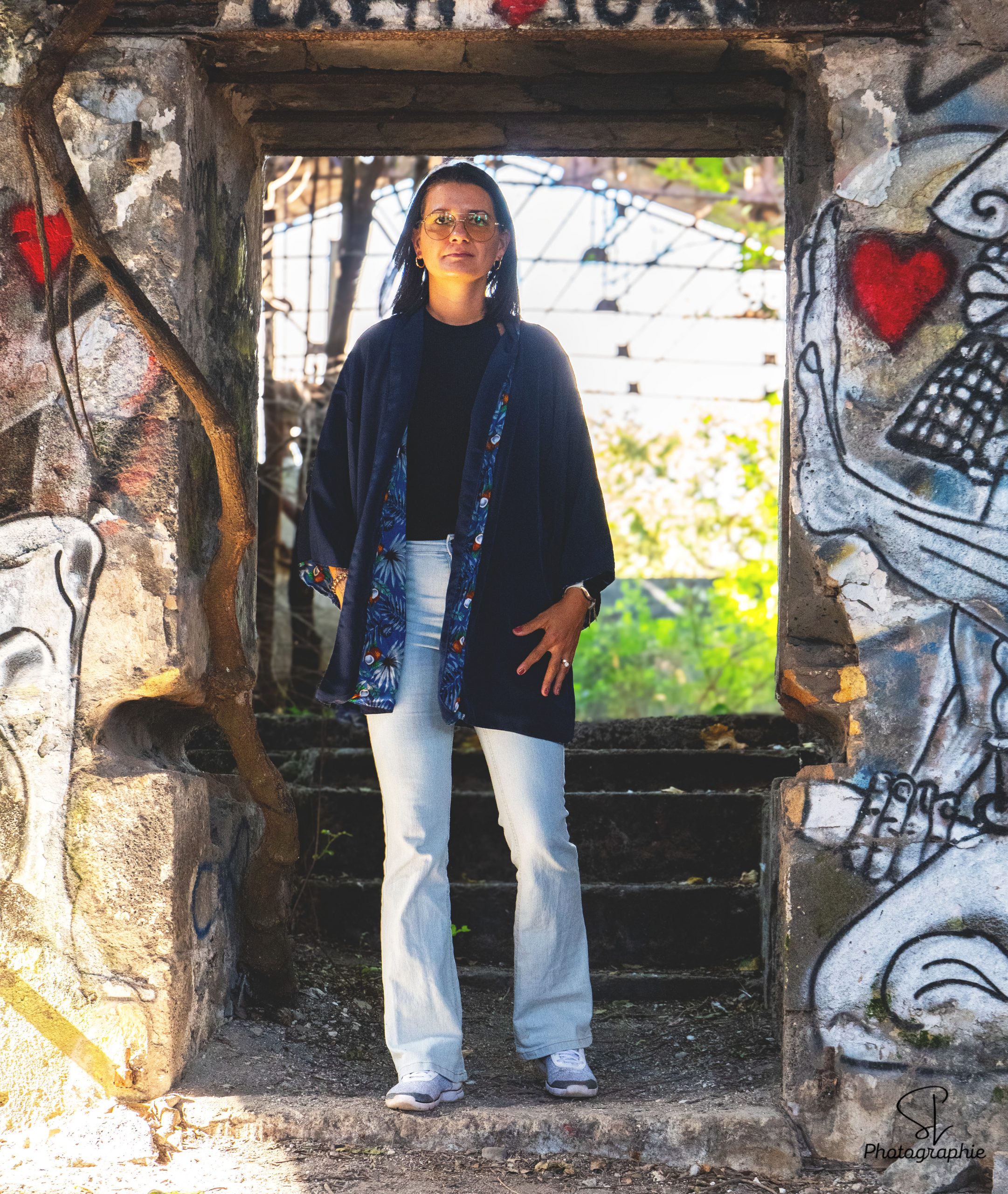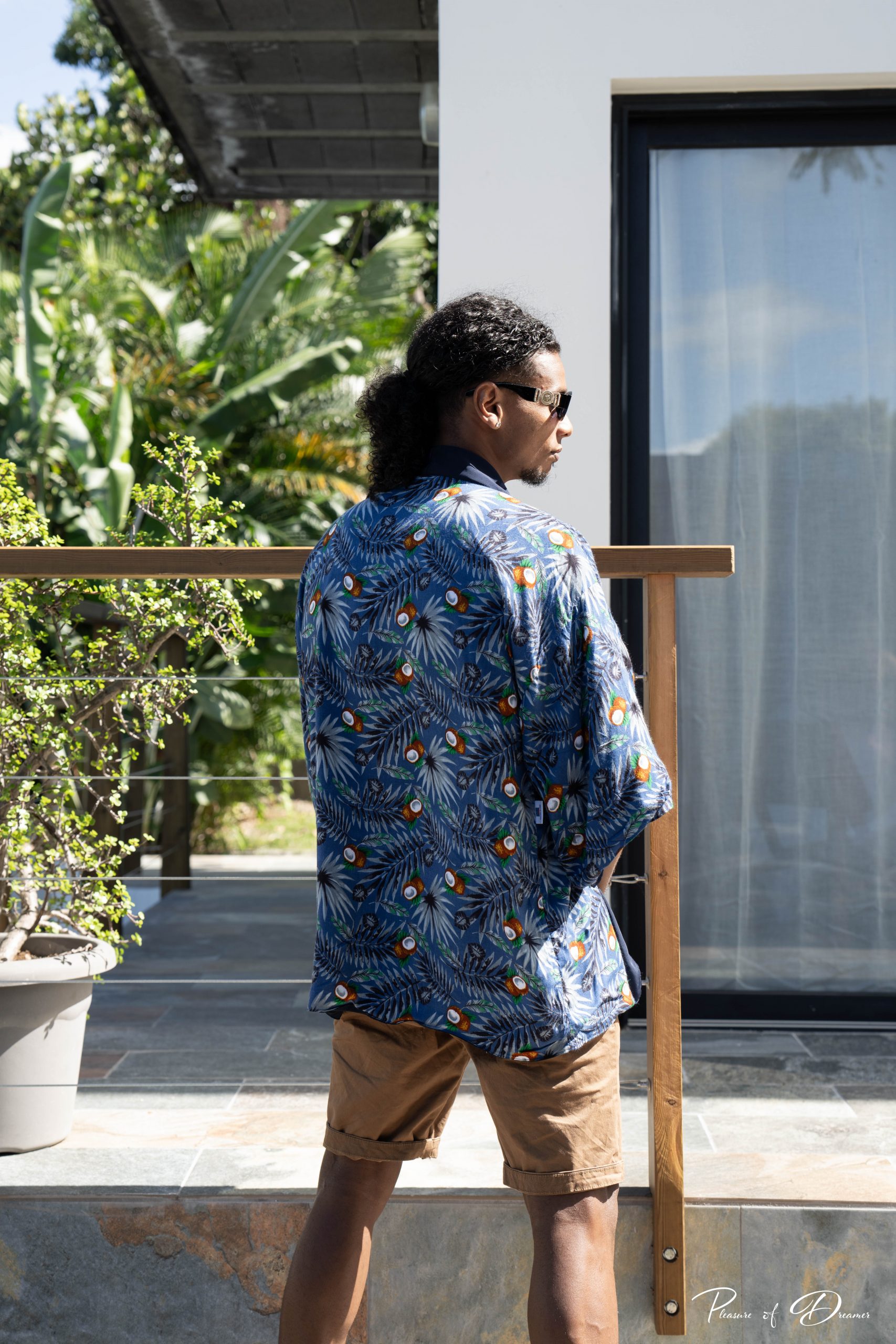 Ce kimono court, taille double M, offre un mélange de style et de confort. Fabriqué de manière artisanale à La Réunion, il présente une face fleurie vibrante et une face unie, offrant ainsi une polyvalence de choix. Sa teinte bleu marine en fibranne et polyester ajoute une touche élégante, tandis que sa conception mixte et inclusive assure un ajustement adapté à tous. Idéal pour une élégance décontractée avec une touche artisanale unique.