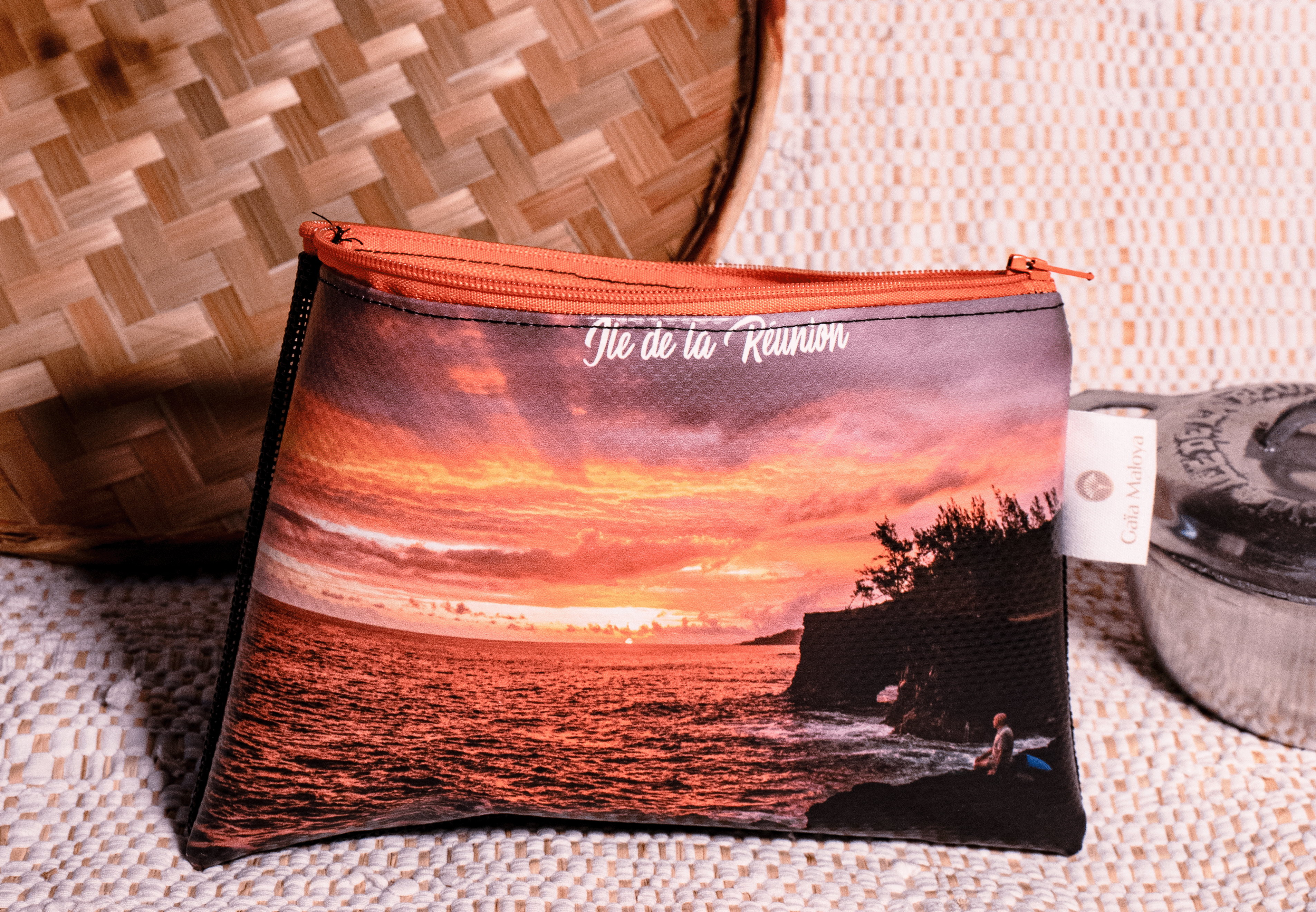 Découvrez notre pochette artisanale Pascal avec sa sublime photo d’un coucher de soleil sur le Cap Méchant, confectionnée avec amour à la Réunion.