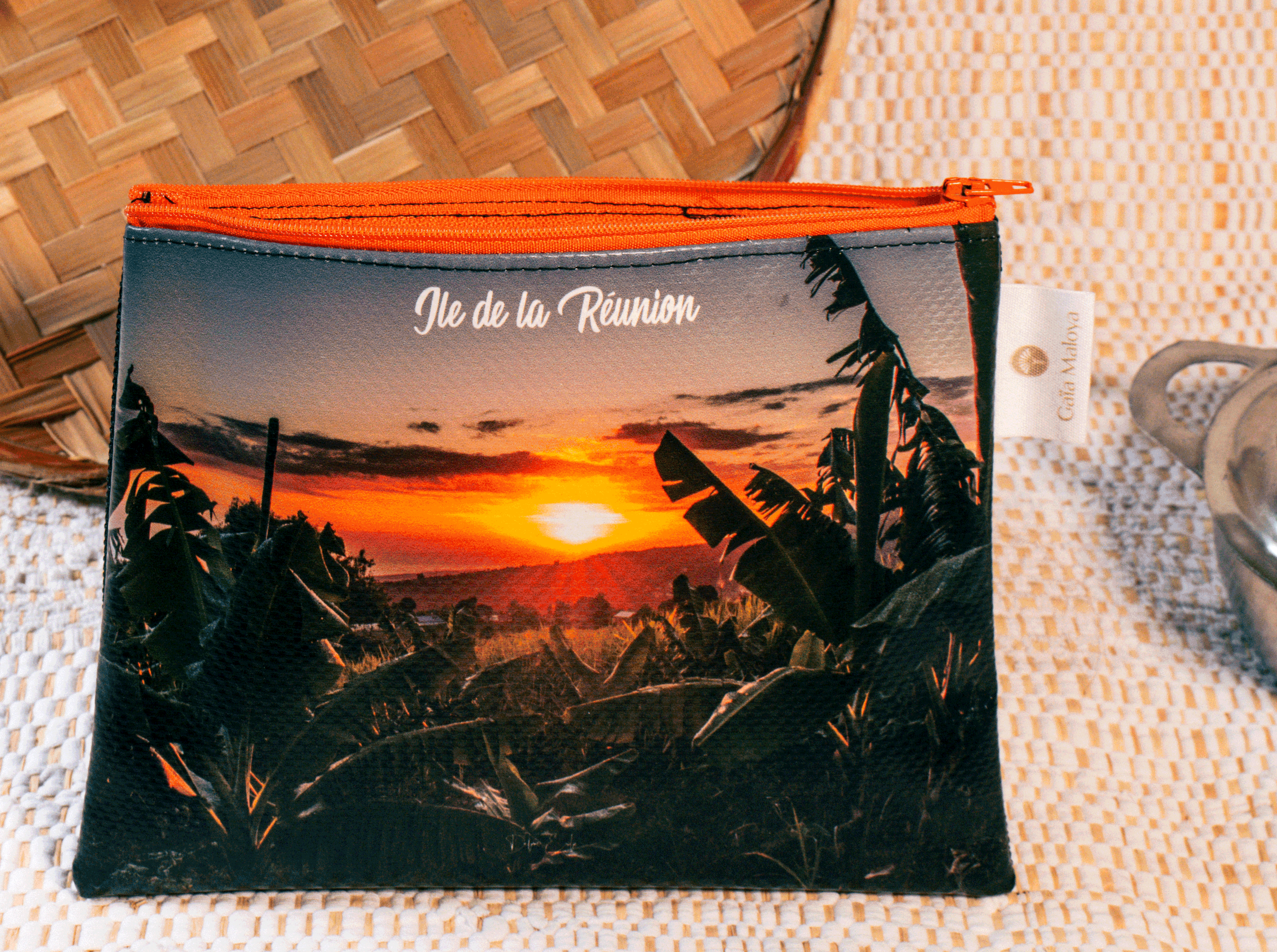 Découvrez notre pochette artisanale Pascal avec sa sublime photo d’un champs de bananiers coucher de soleil sur le Cap Méchant, confectionnée avec amour à la Réunion.