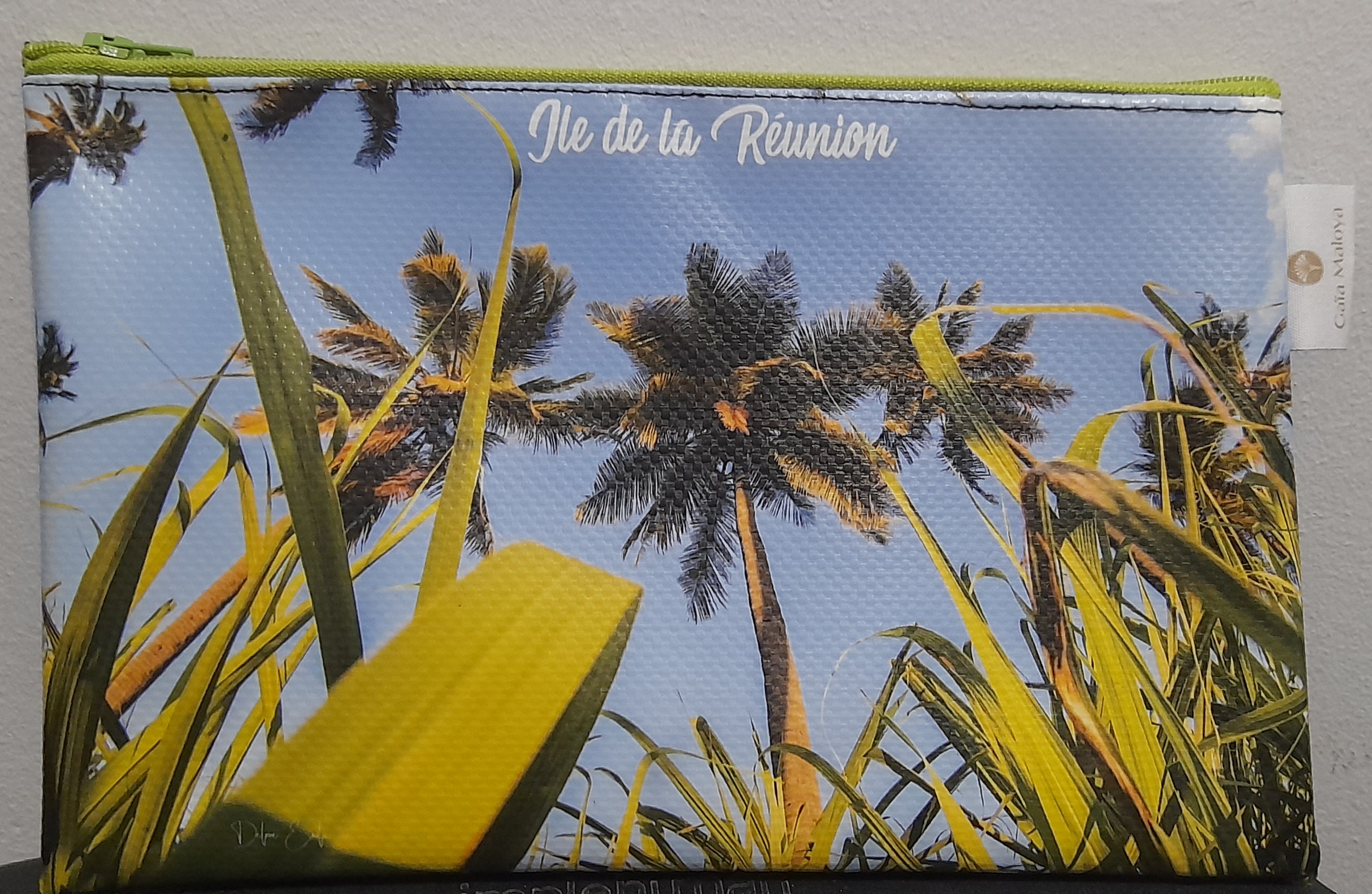 Découvrez notre pochette artisanale Pascal avec son incroyable photo de palmiers prise dans les herbes, confectionnée avec amour à la Réunion.