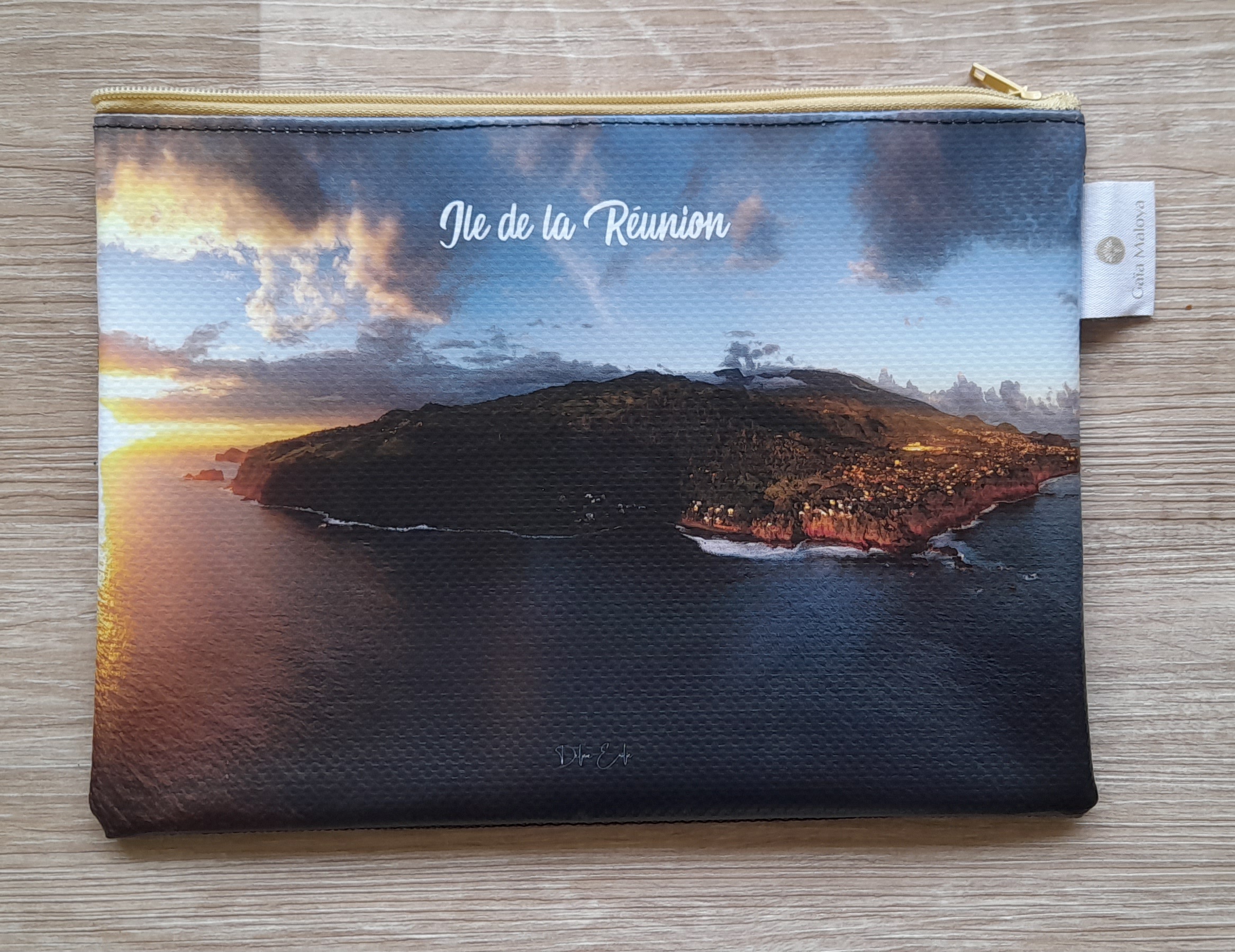 Découvrez notre pochette artisanale Pascal avec son incroyable photo de l’île au coucher de soleil, confectionnée avec amour à la Réunion.
