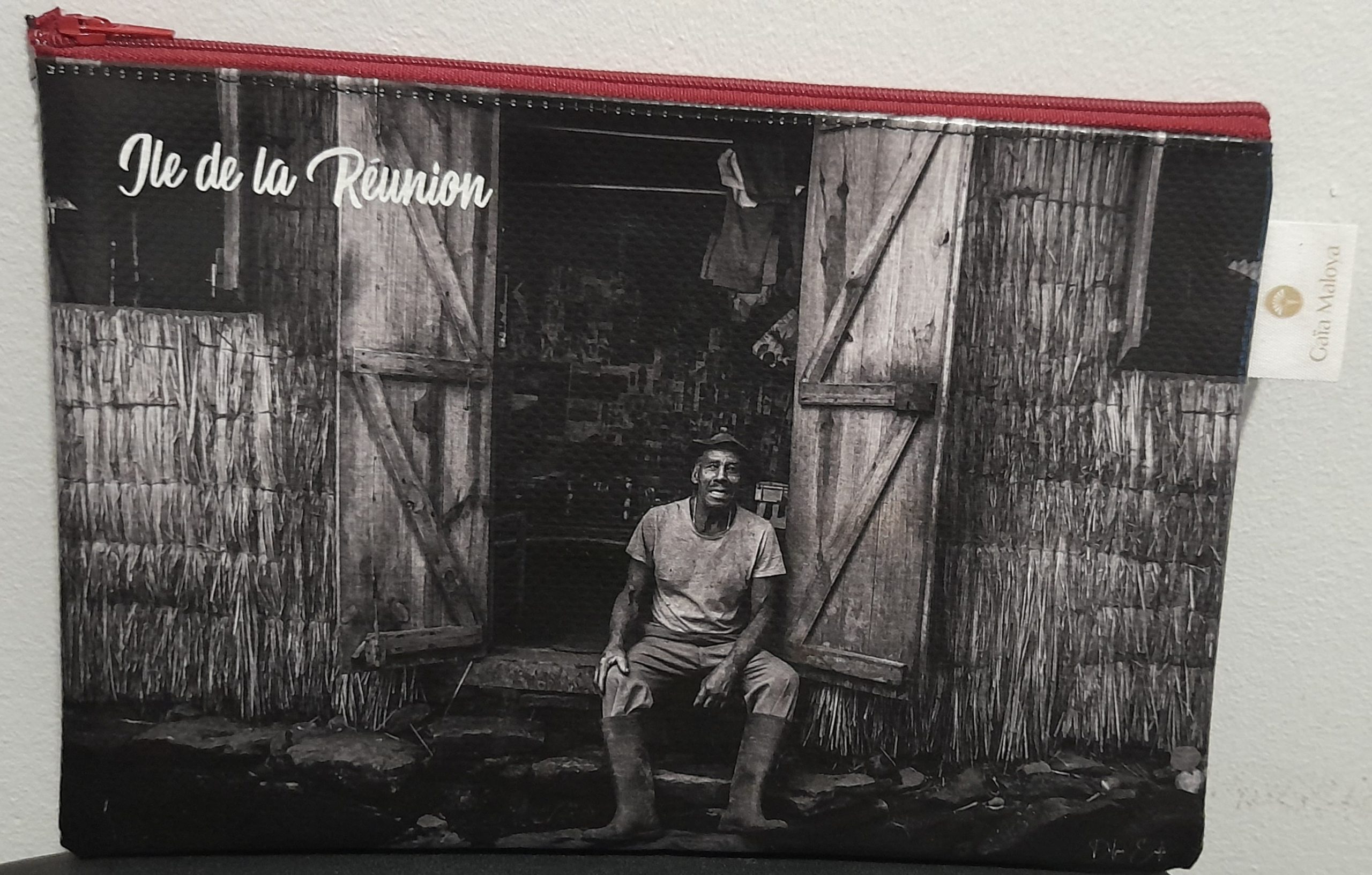Découvrez notre pochette artisanale Pascal avec son incroyable photo d’un gramoun devant sa case, confectionnée avec amour à la Réunion.