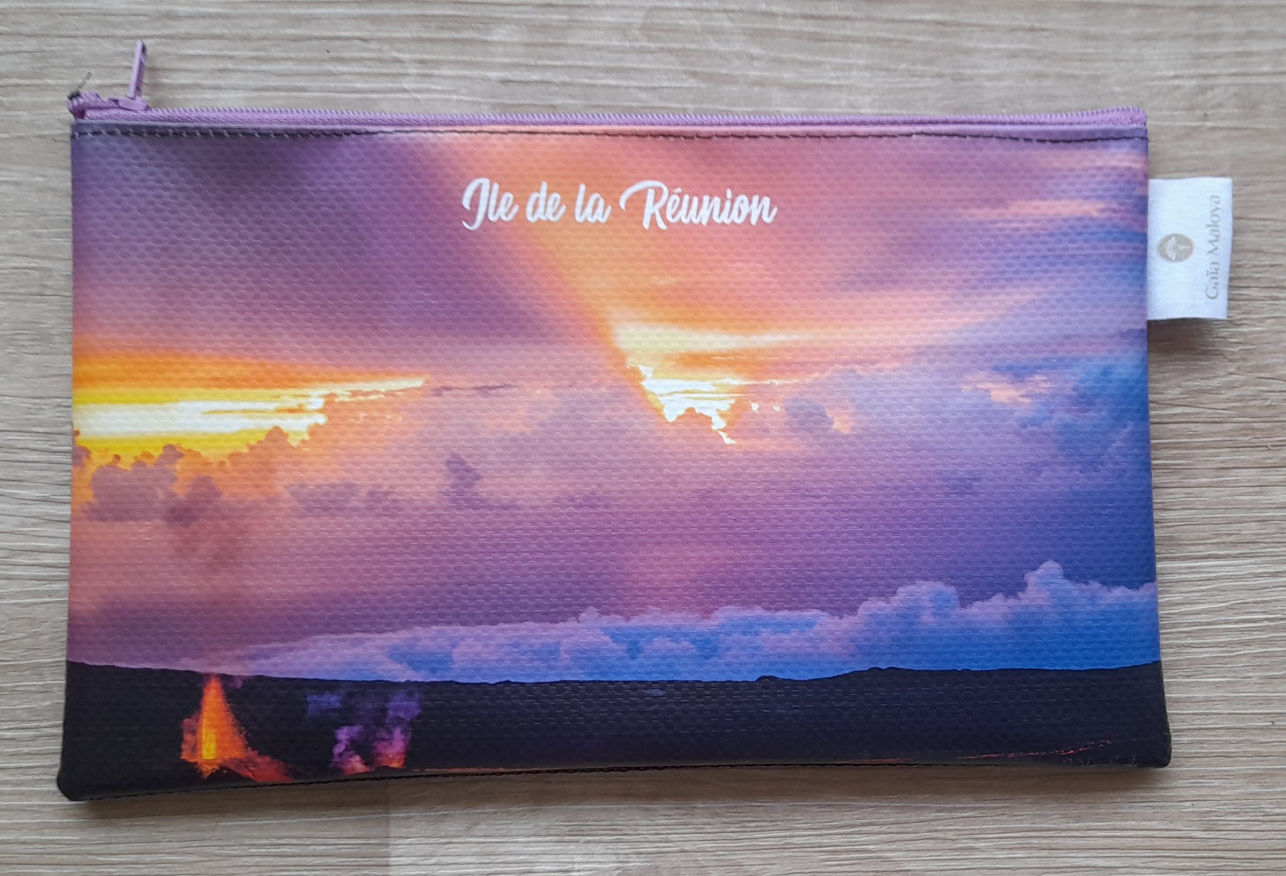 Découvrez notre pochette artisanale Pascal avec son incroyable photo au coucher de soleil du volcan en éruption, confectionnée avec amour à la Réunion.