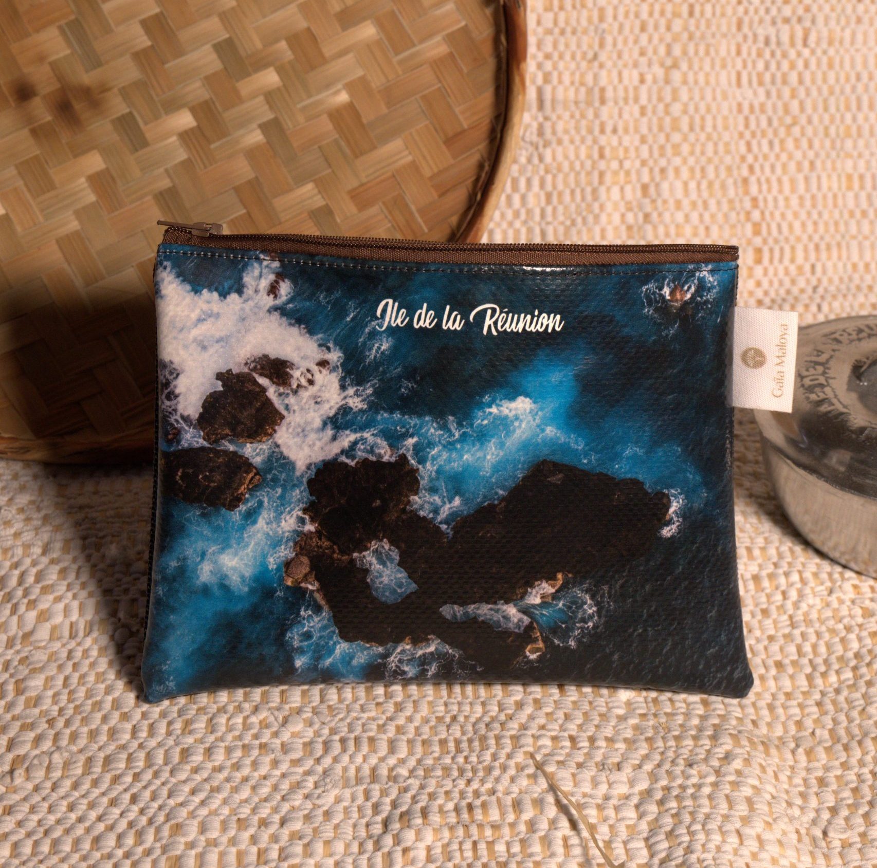 Découvrez notre pochette artisanale Maily avec son incroyable photo prise de Manapany de l’Océan Indien, confectionnée avec amour à la Réunion.