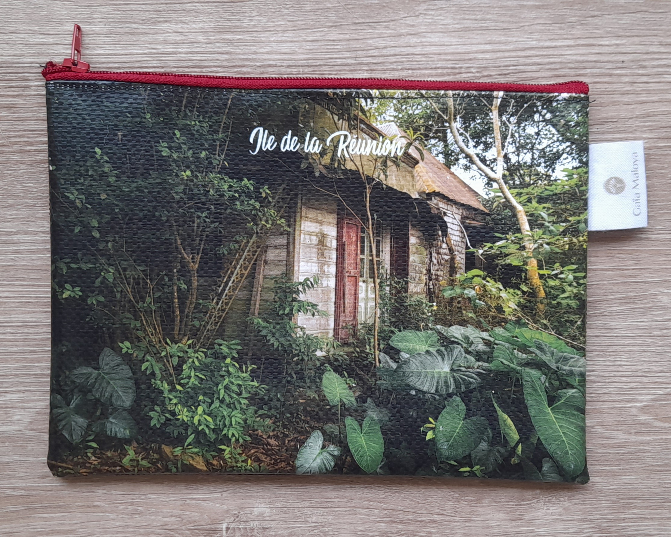 Découvrez notre pochette artisanale Maily avec son incroyable photo de kaze kréole dans la végétation luxuriante, confectionnée avec amour à la Réunion.