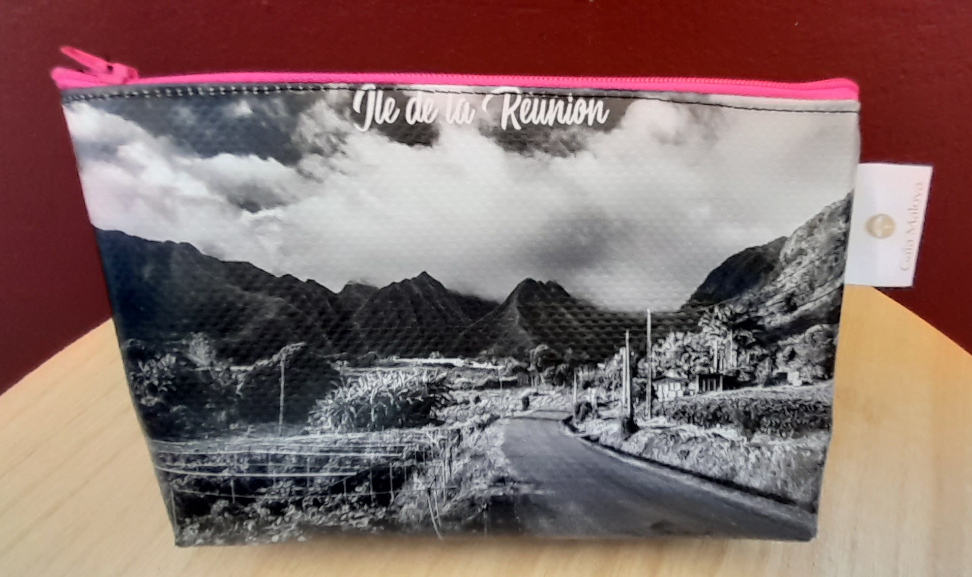 Découvrez notre pochette artisanale Maily avec son incroyable photo de l’Entre-Deux en noir et blanc, confectionnée avec amour à la Réunion.