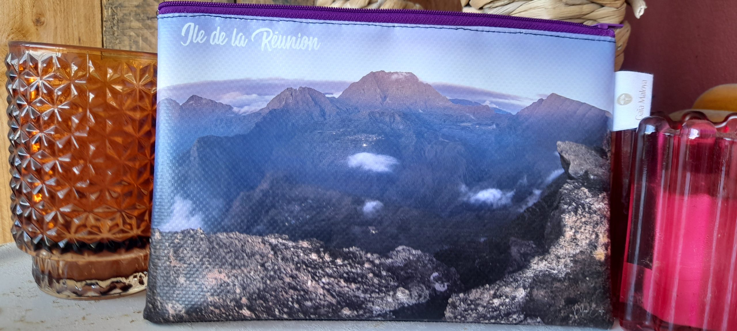 Découvrez notre pochette artisanale Maily avec son incroyable photo d’un lever de soleil au Maïdo, confectionnée avec amour à la Réunion.