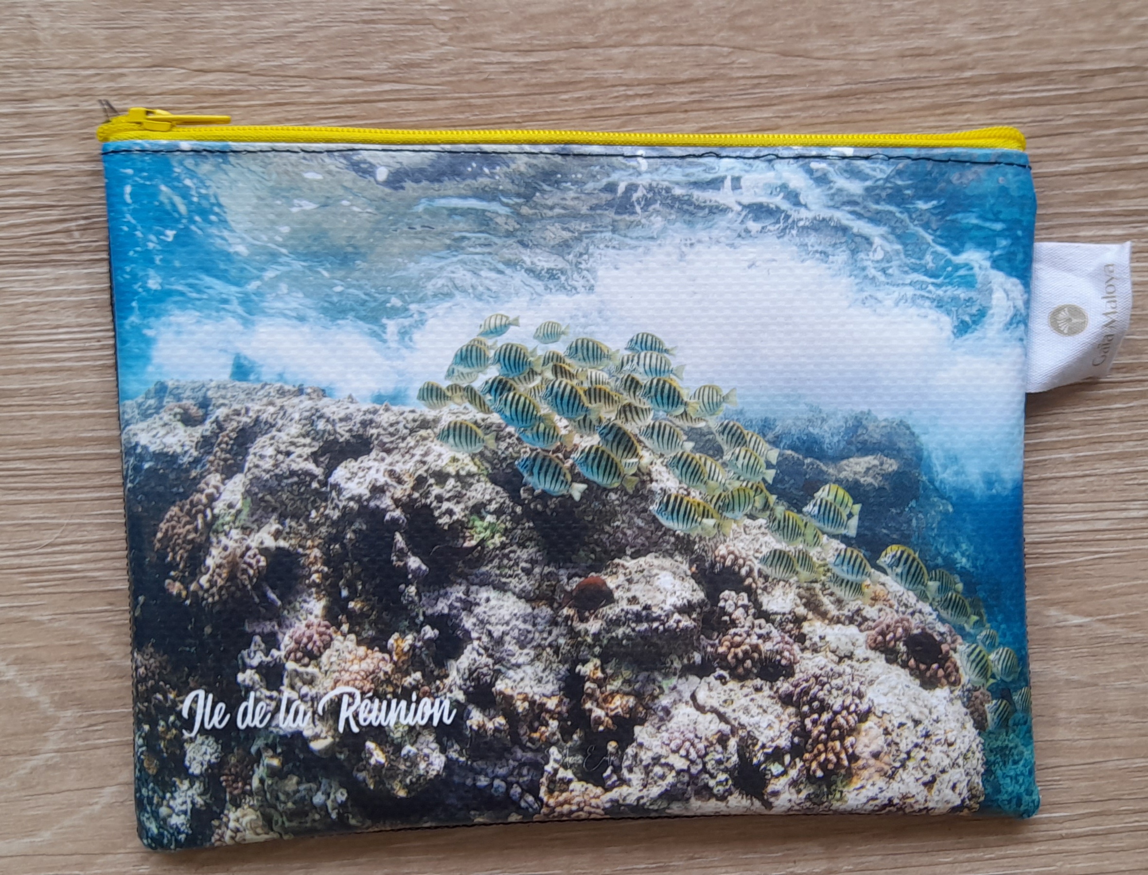 Découvrez notre pochette artisanale Maily avec sa sublime photo du lagon avec ce banc de poissons chirurgiens bagnard, confectionnée avec amour à la Réunion.