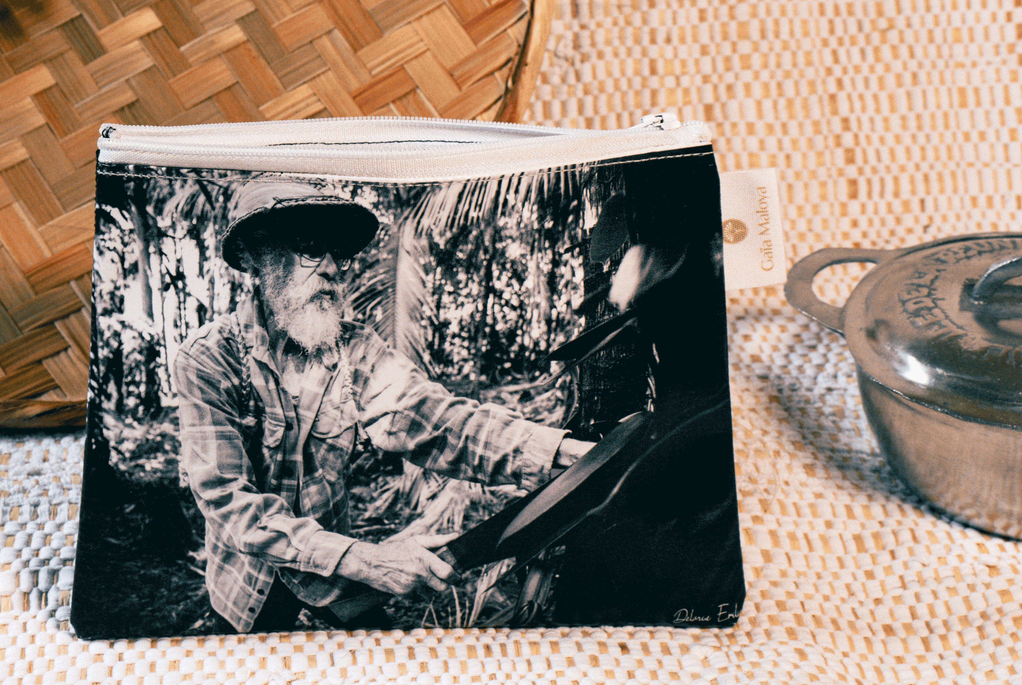 Découvrez notre pochette artisanale Maily avec un superbe portrait d’une figure iconique de la Réunion, Monsieur Leichnig producteur de vanille, signé par Emilie Delarue. Confectionnée avec amour à la Réunion.