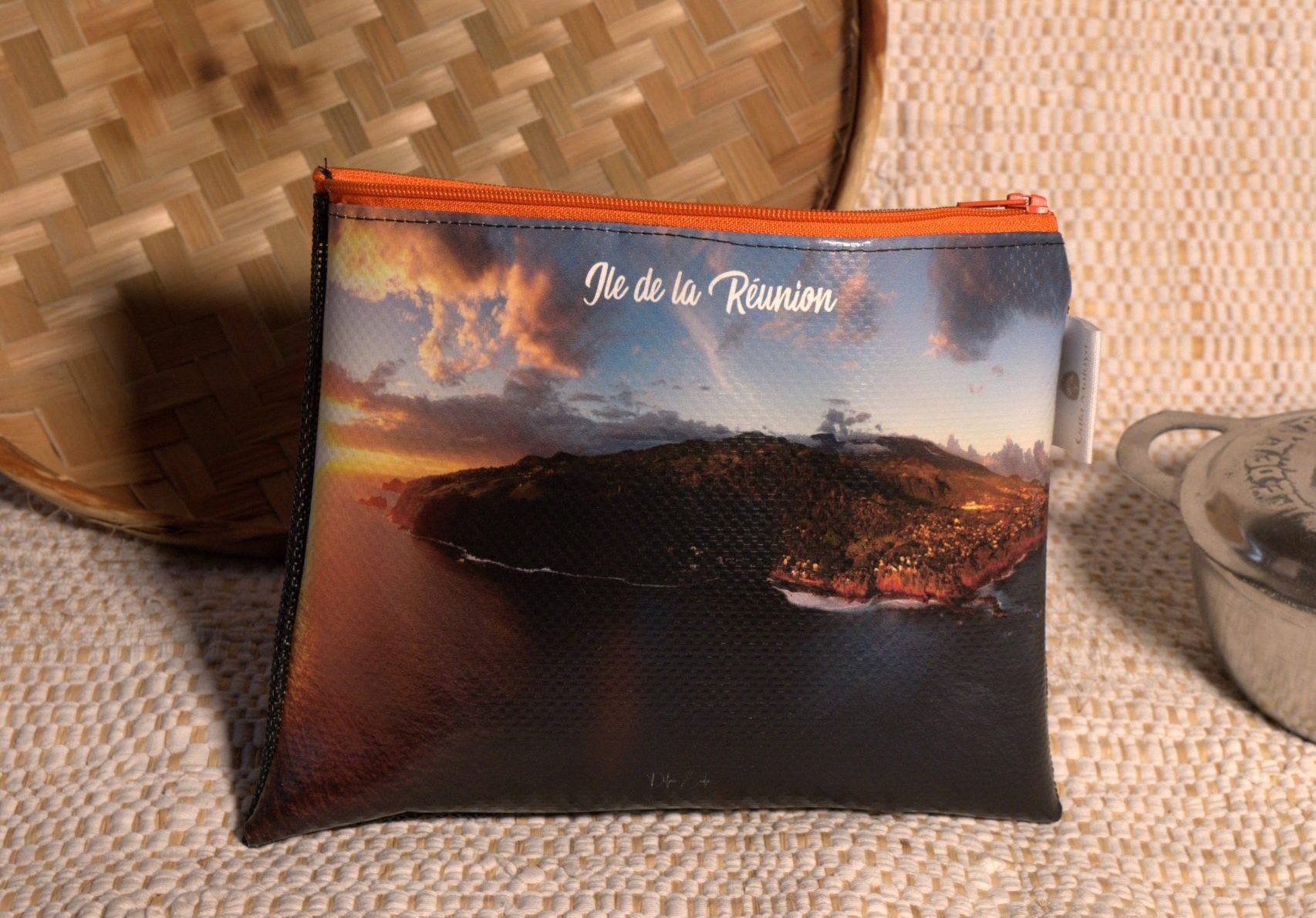 Découvrez notre pochette artisanale Maily avec son incroyable photo au coucher de soleil de l’île, confectionnée avec amour à la Réunion.
