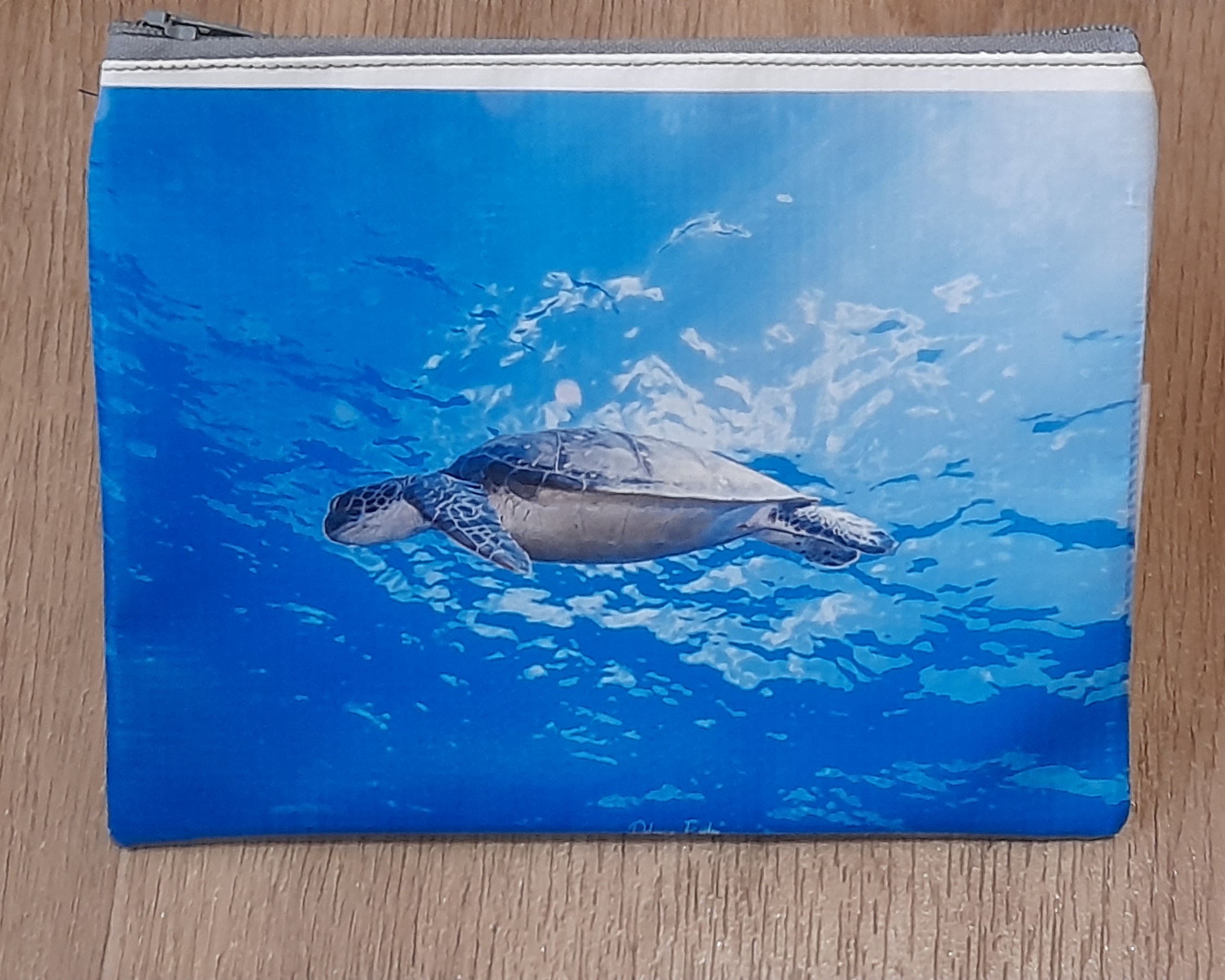 Découvrez notre pochette artisanale Maily avec son incroyable photo d’une tortue, confectionnée avec amour à la Réunion.