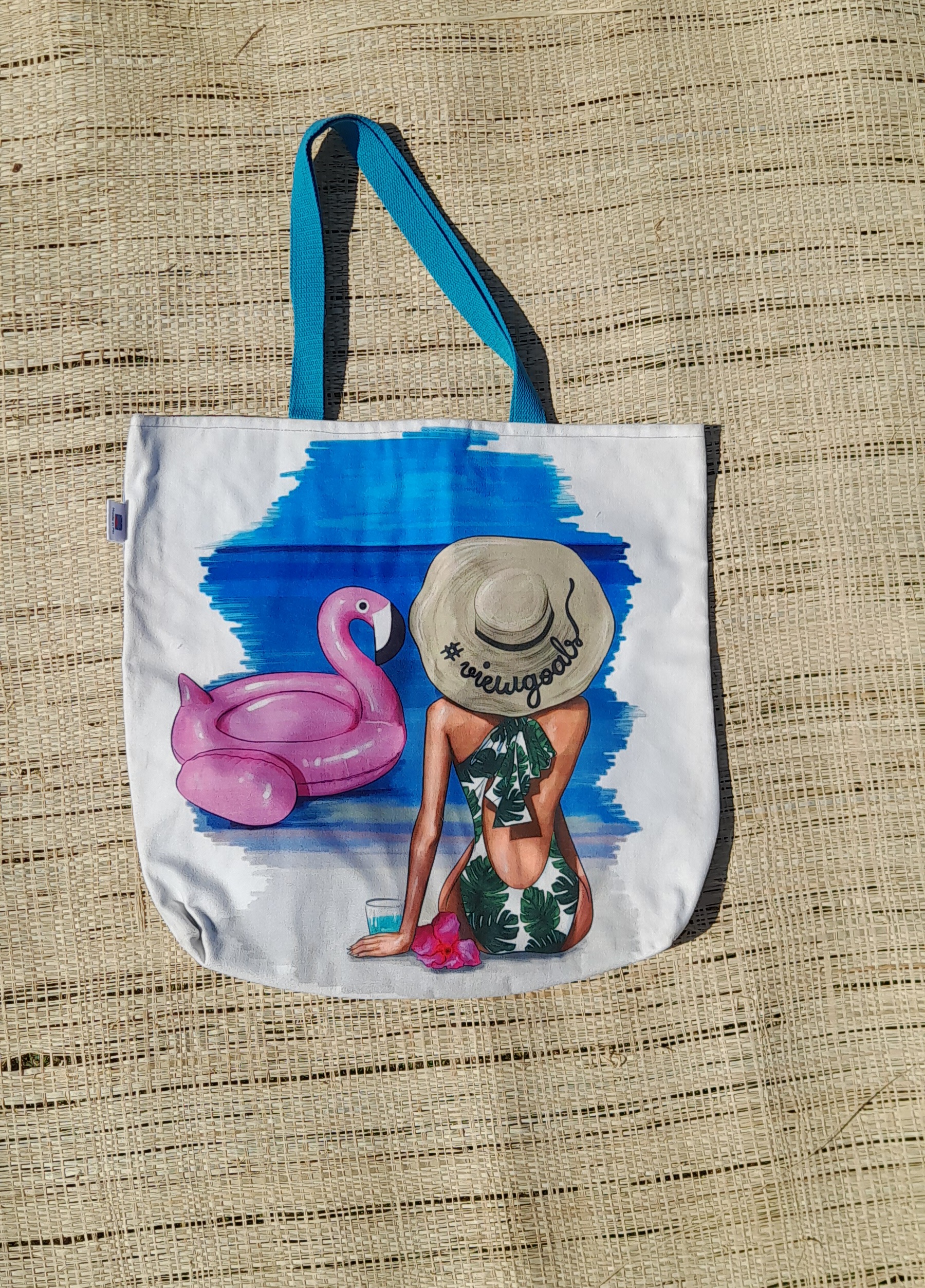 Ce sac cabas unique, fabriqué à la main, est un mélange parfait de style et de durabilité. Conçu avec du textile recyclé, il affiche une impression artistique vibrante d’une femme à la plage. Les couleurs vives et le design élégant font de ce sac un choix idéal pour une fashionista soucieuse de l’environnement.